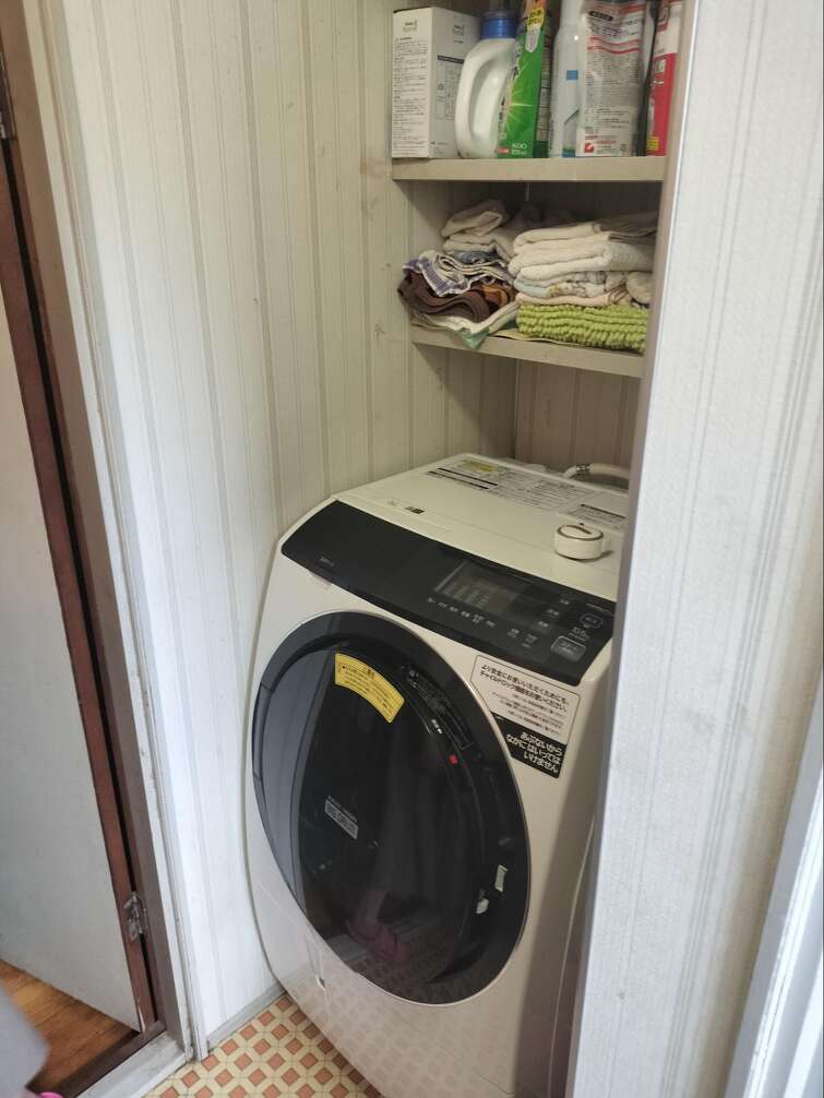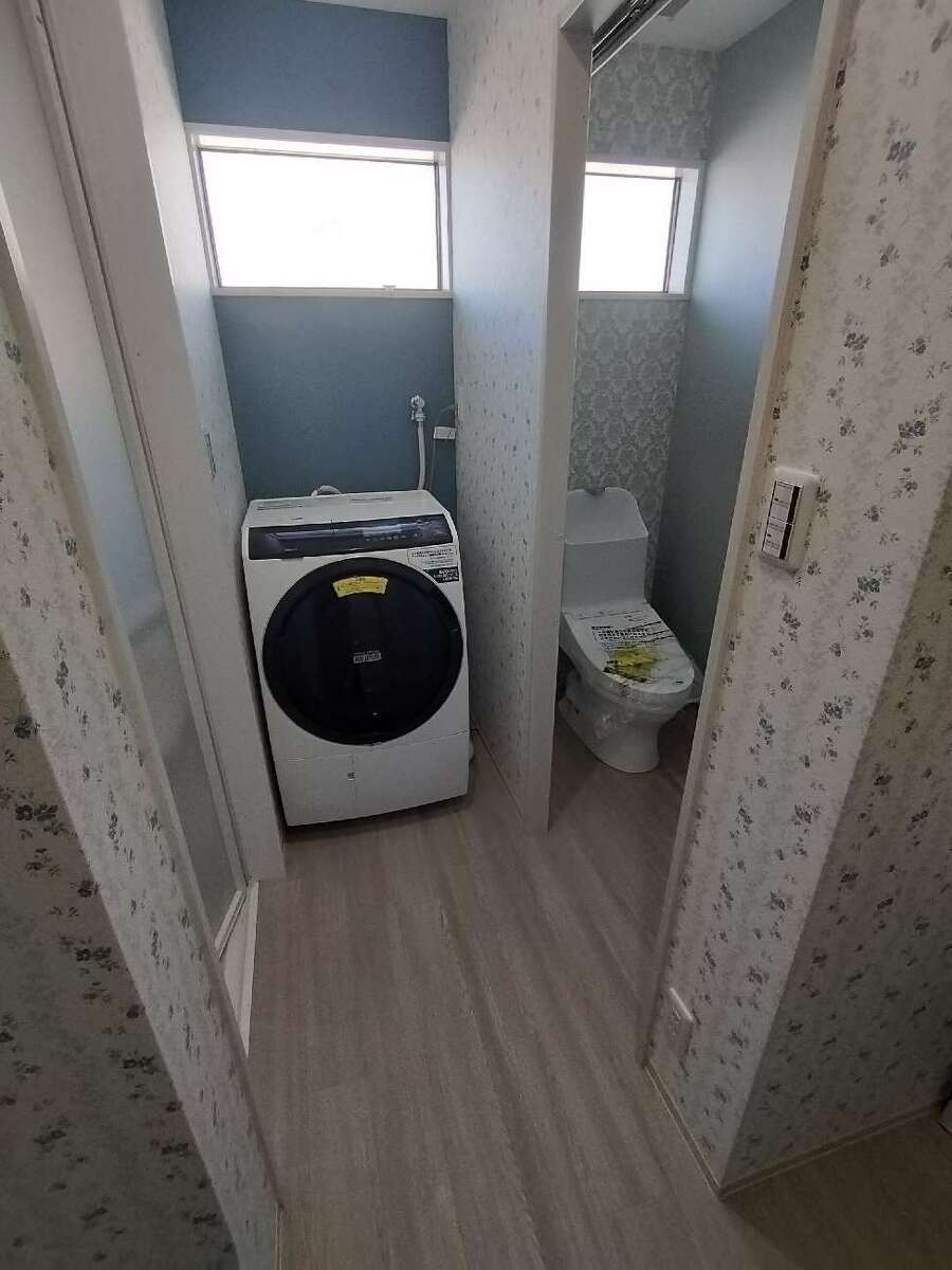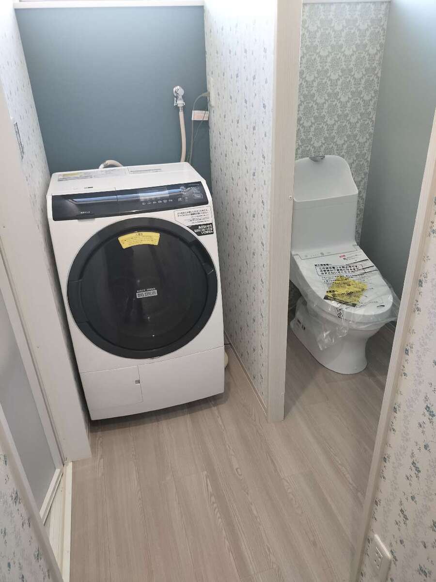 屋外の和式トイレを屋内の浴室スペースに取り込み、お風呂前後に使いやすい動線へと改善。洗面脱衣所も広くなり、ドラム式洗濯機を置ける実用的な空間になりました。