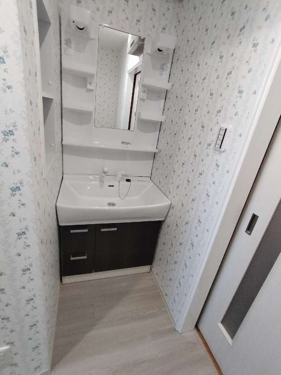 洗面所横にはニッチを新設し、ブルーのアクセントクロスでおしゃれな印象に。収納は棚の位置を変更し、可動棚を設置することで限られたスペースでも使いやすく仕上げています。