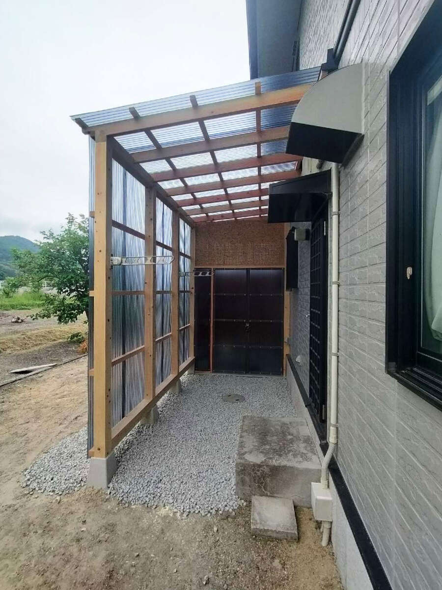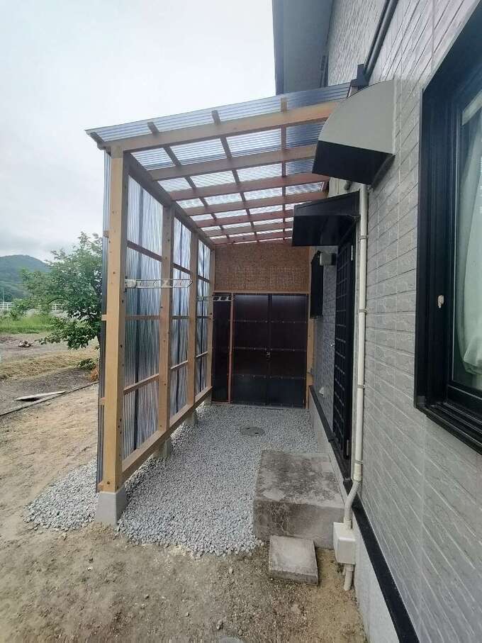 お客様から「少し離れた倉庫に置いているお米用の冷蔵庫を、自宅裏に移したい。」「ちょっとした洗濯物を干せるスペースもあれば便利」「防犯のためにカメラと鍵もつけたい」とのご相談をいただきました。