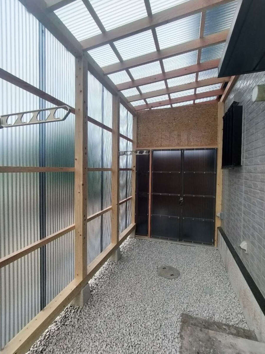 また、大工造作による鍵付きの扉を設置し、防犯面を強化しました。外側から中が見えないようOSBボードで目隠しを施し、同時にボード面にはほうきなどを掛けられるようにして、収納性と利便性も向上させています。